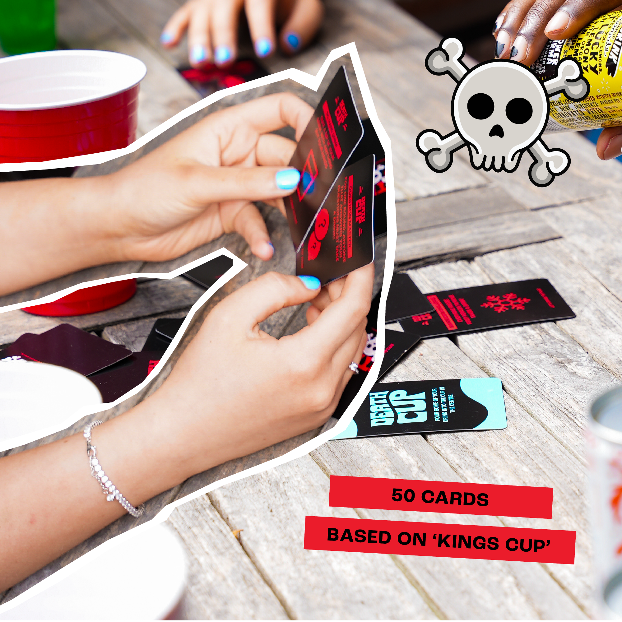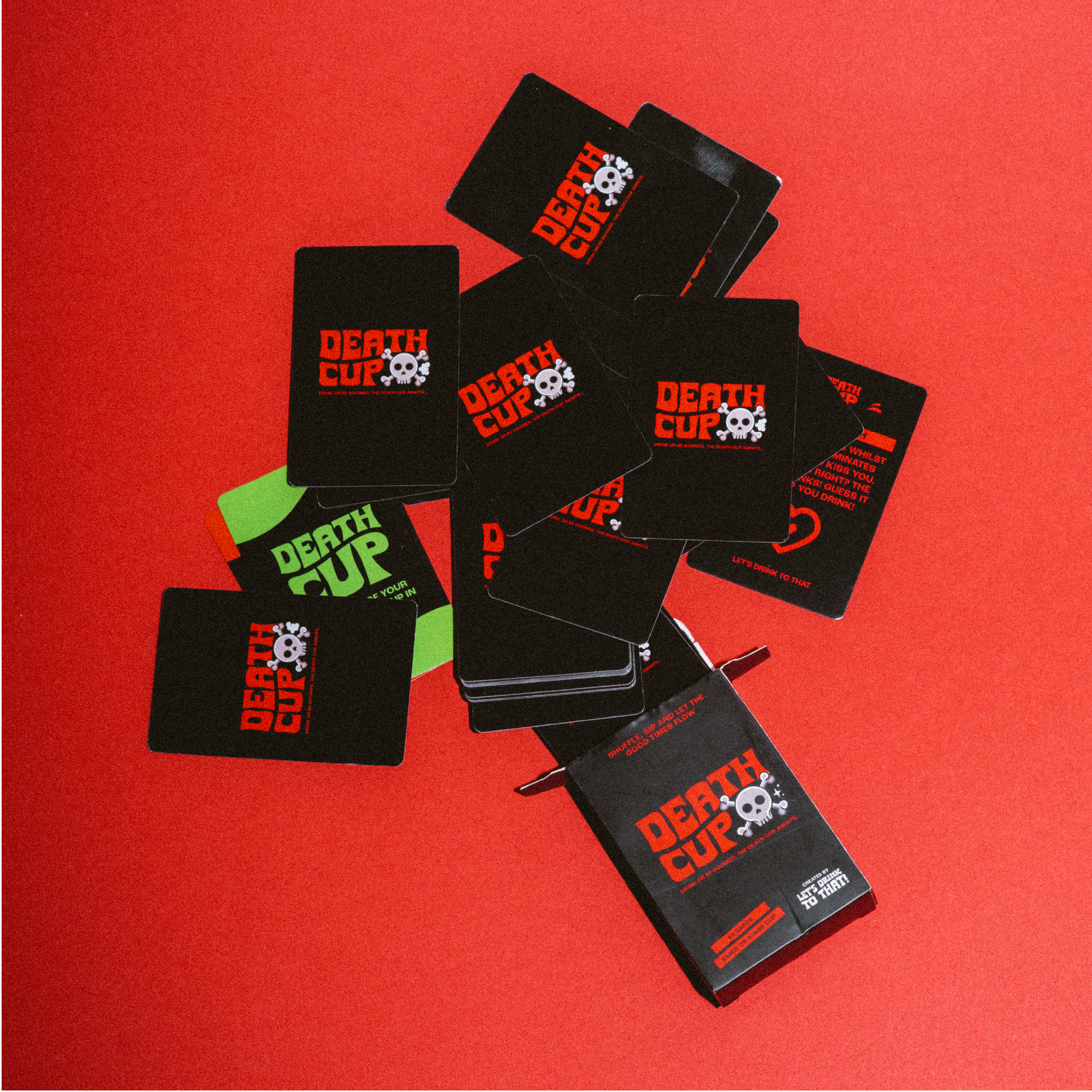 📝 HOW TO PLAY: Spread the cards around a cup and begin to play! every time a 'Death Cup' is pulled you must pour some contents of your drink into the cup in the middle, Do this every time till the last death cup is pulled! whoever pulls the last death cup must finish the drink in the middle and the game is finished!🔎 WHAT’S INSIDE: There are x50 dynamic cards that printed on premium playing cards designed to start your night right.