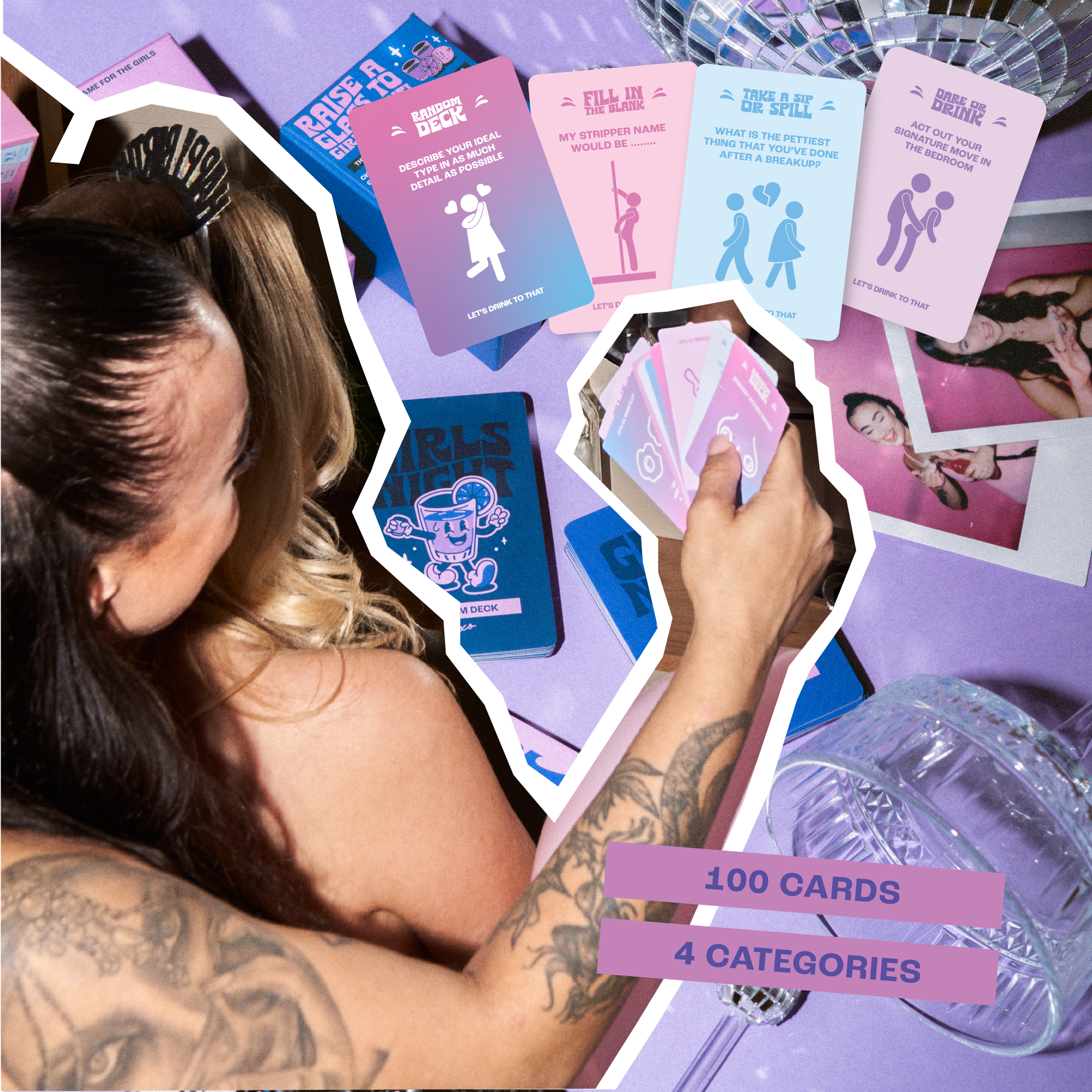 📝 HOW TO PLAY: Drinks at the ready!, Shuffle up the cards or play them by categories, spread them around and take turns pulling a card. Each time a card is drawn, the player has to perform an action associated with that card and category. The longer you play, the tipsier you get! 🔎 WHAT’S INSIDE: There are x100 dynamic cards that printed on premium playing cards designed to start your night right.