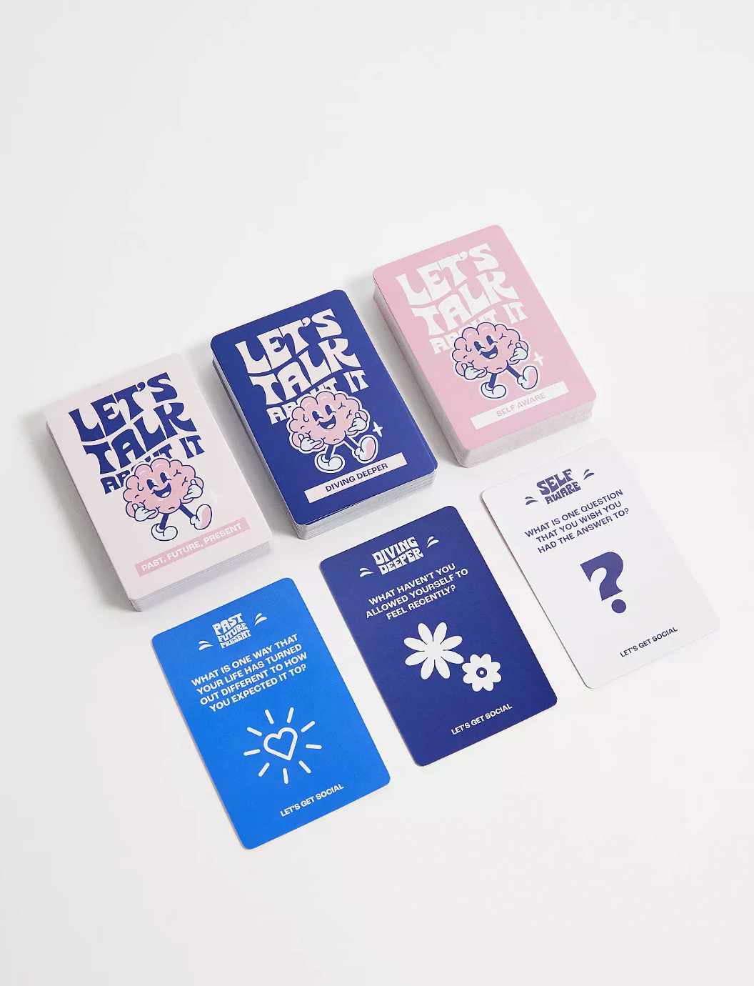 - x120 cards split into 3 categories of 'Self Aware' 'Past, Future, Present' and 'Diving Deeper'