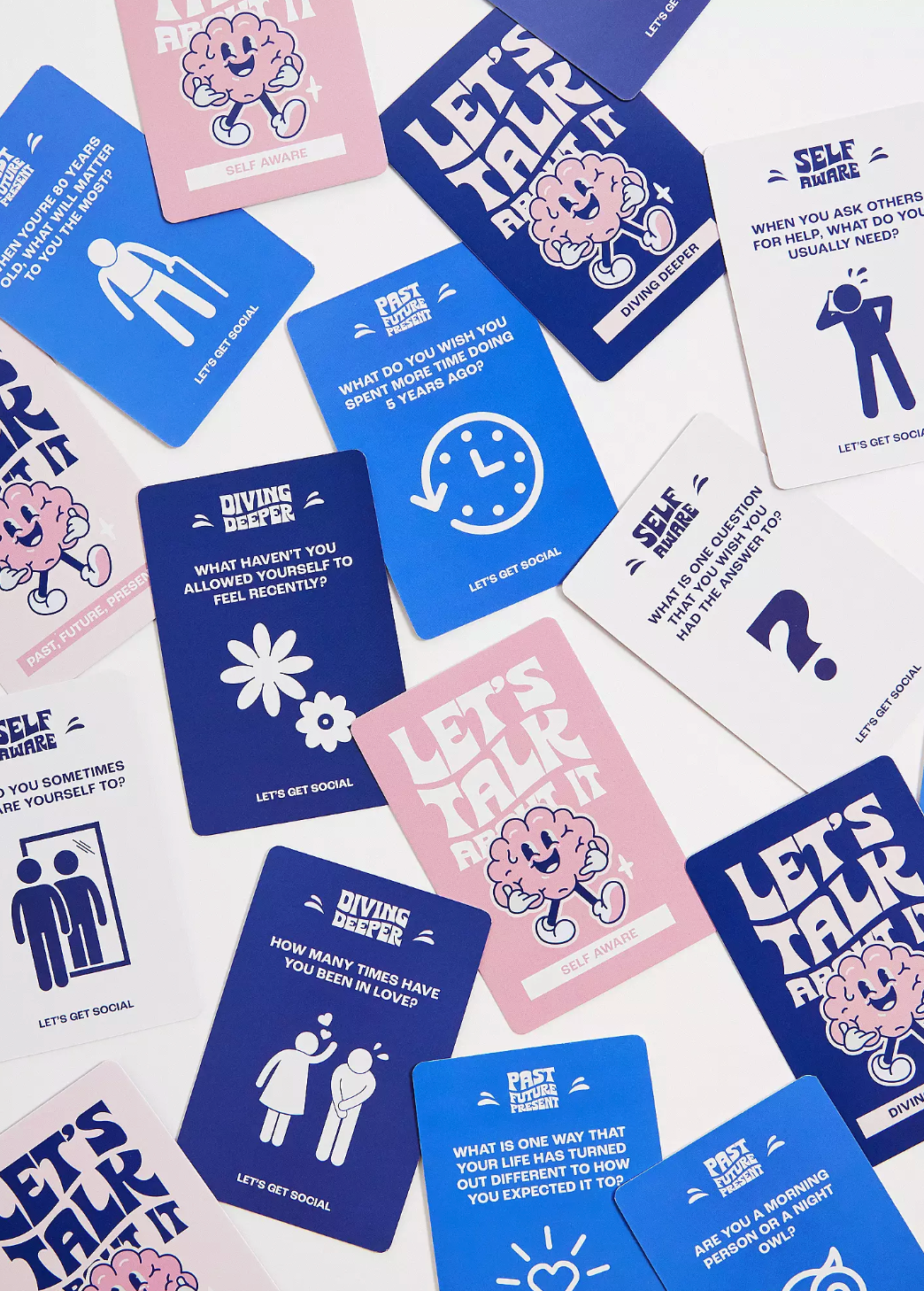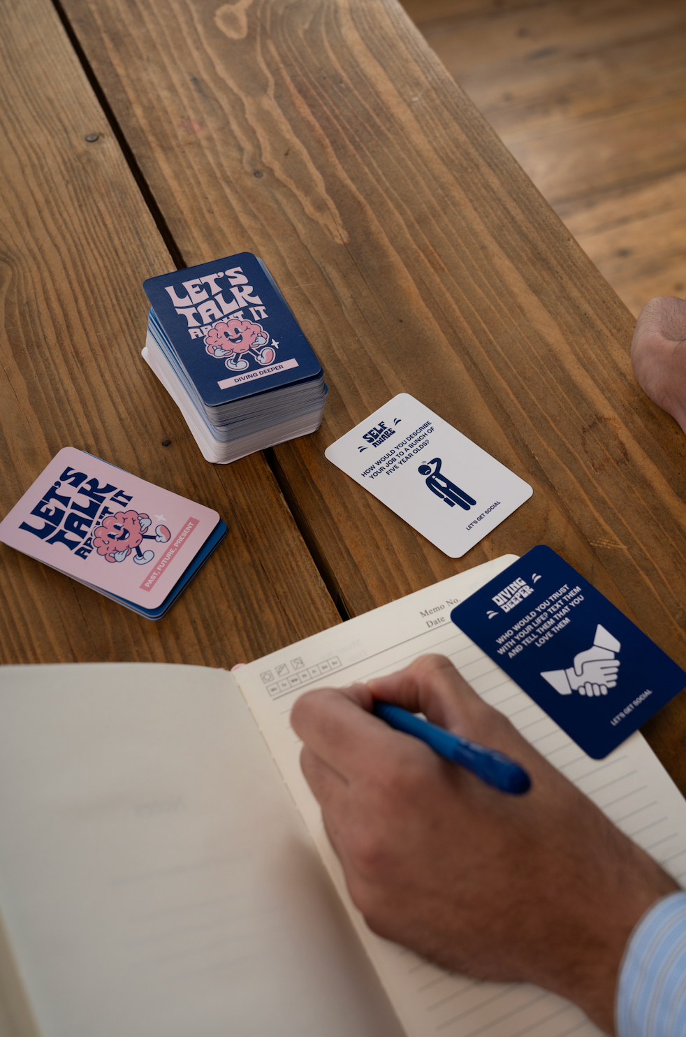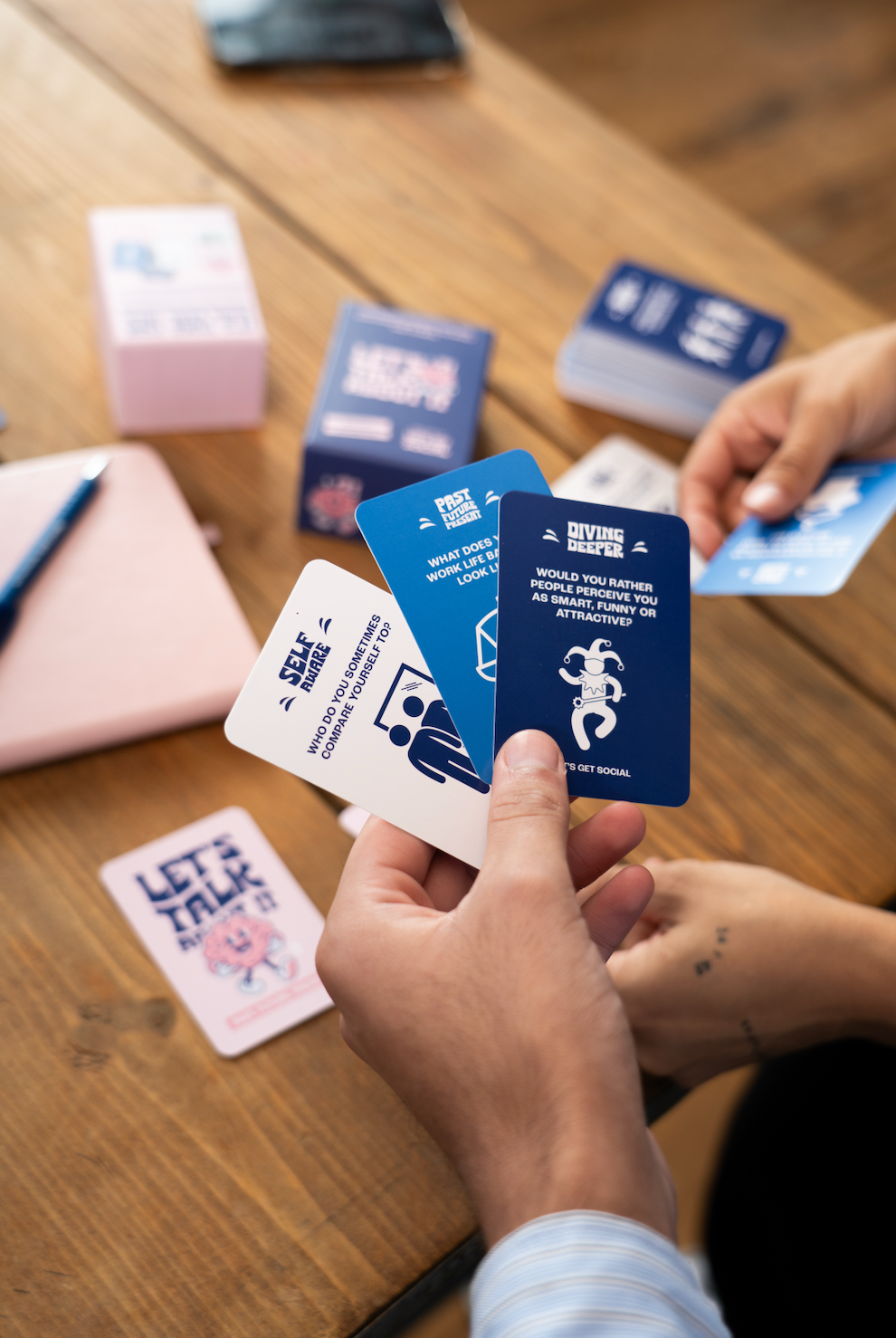 📝 HOW TO PLAY: Play solo and journal your thoughts and responses or play with a friend, partner or family member. Shuffle all cards together, or play one category at a time leaving 'Diving Deeper' until last.