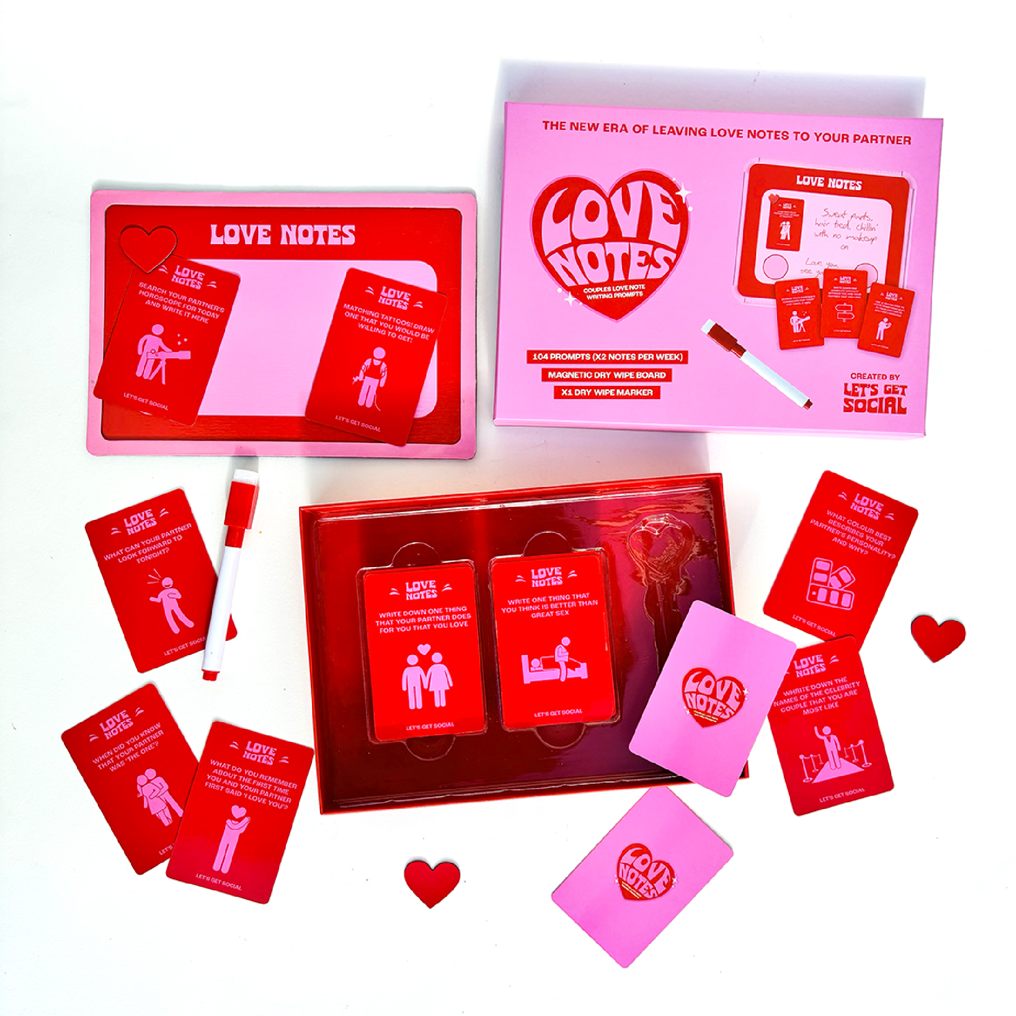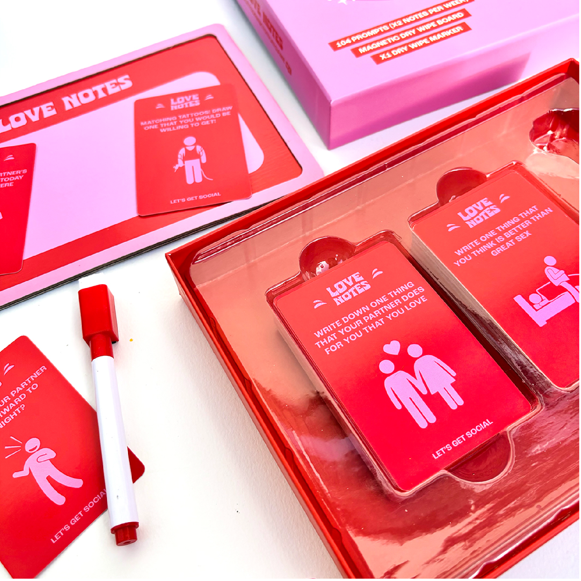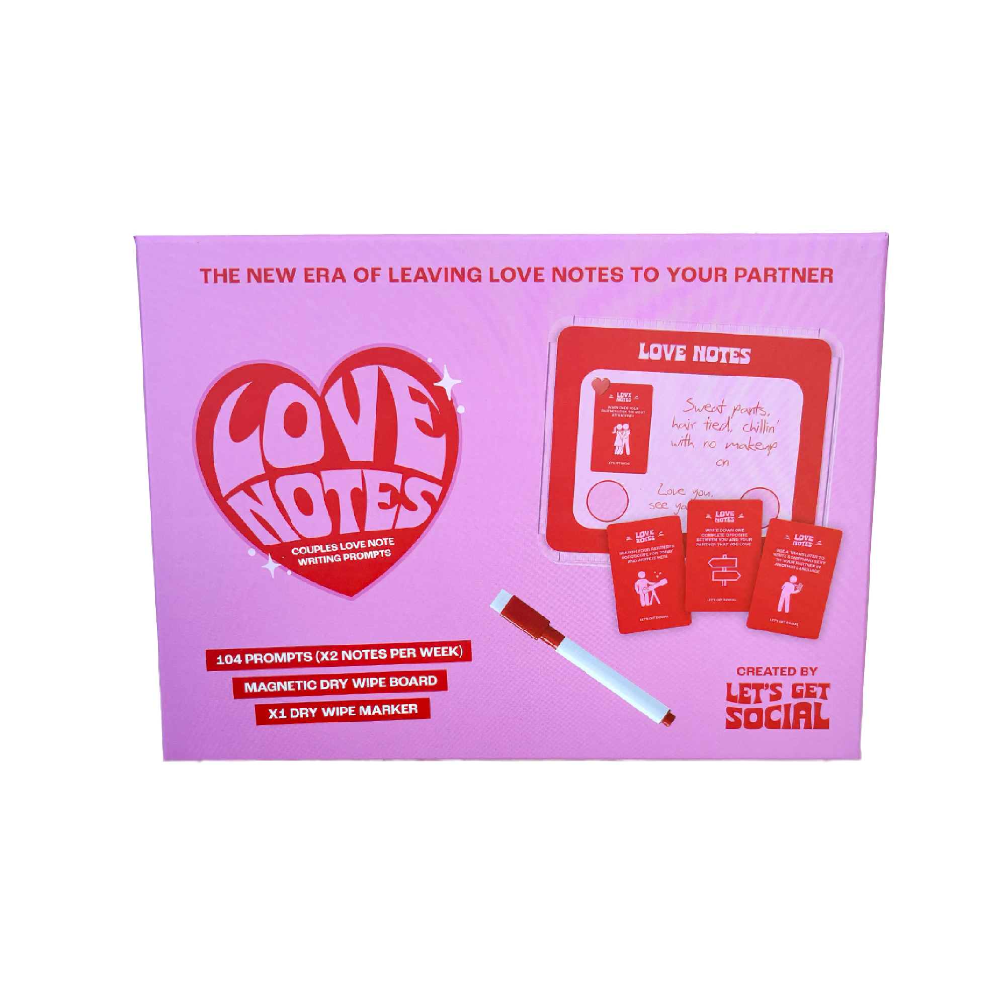 Magnetic dry wipe board with 104 prompts to attach to your fridge and take it in turns twice a week to leave wholesome, funny and relatable notes to your partner. Including 104 card prompts so that you and your loved one can take it in turns for the duration of the whole year, coming home to surprise love notes!